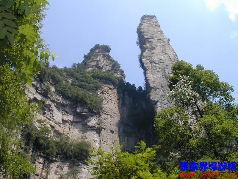 (金鞭巖、神鷹護(hù)鞭)如果要問張家界國家森林公園的標(biāo)志景點(diǎn),答案是現(xiàn)成的:金鞭巖。早在清代中期,一些文人就把張家界的峰林及百丈峽列入“永定八景”。其一叫“危峽啼猿”;其二叫“層巖涌塔”:“縣西二十里青崖山,其前五山并立,層峙如浮圖。中一峰更峻拔,上插宵漢,晴輝雪積,最擅奇觀。”這里說的“其中一峰”,指的金鞭巖。八大景點(diǎn)張家界占其二,可見先人是有眼力的。金鞭巖相對高度380多米,拔地而起,直插云霄,無論你遠(yuǎn)看近看,正看側(cè)看,都是一根刺破青天的長鞭!在金鞭巖左側(cè)的那座巖峰,大家看多像一只兇猛的老鷹,勾嘴瞪眼,雙翅略展,時刻警覺地守護(hù)著金鞭,人稱“神鷹護(hù)鞭”。