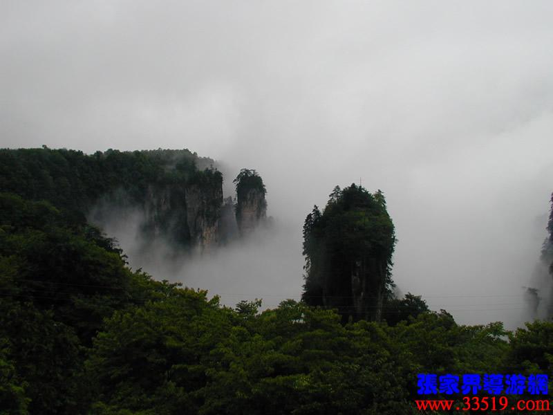 這里,我還給大家講個奇異現(xiàn)象。1991年4月的一天下午,雨過天晴,整個天子山漫開一片朦朦朧朧的薄霧,從西海到神堂灣一帶,一座座巖峰在霧中時隱時現(xiàn)。一群上海游客來到點將臺,忽然,一幅奇異的場景把大家驚呆了:神堂灣中央,七位少女從云霧中飄落到一座巖峰峰頂?shù)钠脚_上,飲茶、撫琴,翩翩起舞達40分鐘之久。游客們起初以為是一種幻覺,揉揉眼睛再看,仍然是三綠四紅,長發(fā)披肩,體態(tài)婀娜,舞步輕盈。直到“仙女們”隨一片云霧漸漸隱去的前一秒鐘,大家仍然不敢弄出半點聲響,有相機的就拼命按快門。遺憾的是距離太遠(yuǎn)了,當(dāng)晚將膠卷取去沖洗,什么也沒留下。消息傳開后,有人相信,有人不相信。其實,神話也好,事實也好。這種奇異現(xiàn)象完全可用科學(xué)去解釋。“海市蜃樓”這是人所共知的;而大沙漠中不也經(jīng)常出現(xiàn)綠洲、村莊、城市么?