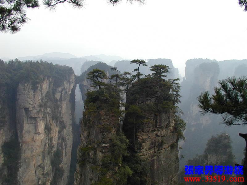 (天下第一橋)更多天下第一橋圖片>>>> 那就是“天下第一橋”。你們看,兩座山峰被一條長廊連在一起,形成天然橋洞,平時吞云吐霧,氣勢壯觀雄奇。橋面寬約兩米,長20余米,絕對高度357米。橋上蒼松挺拔,橋邊古藤垂掛,橋下深不可測。走在橋上,只見霧氣蒸騰,松濤呼嘯,石橋好像也顫顫悠悠,晃晃搖搖似的,令人驚心動魄。這里是張家界風(fēng)景一絕,是大自然的一個奇跡。