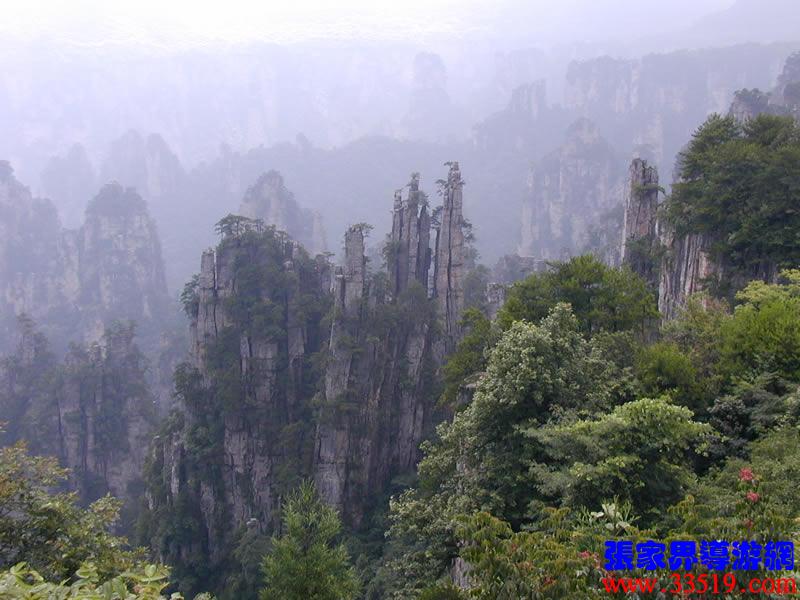 (大觀臺)這就是大觀臺。極目遠(yuǎn)眺,千百座奇峰盡收眼底。一位詩人說,武陵源的砂巖峰林是一步一觀景,千步千造型,一山有四季,十步不同天。專家測算出武陵源石峰有3103座。一如一位高超的雕塑大師,模擬宇宙萬物,無不形狀逼真,維妙維肖,栩栩如生,呼之欲動。有的如海螺出水,有的如金龜銜日,有的如蓮花盛開,有的如天橋橫空,有的如長槍刺天,有的如寶塔聳立,有的如老人采藥,有的如玉女梳妝,有的如將軍出征,有的如戰(zhàn)馬長嘯,有的如情人幽會,有的如夫妻相擁,有的如仙女散花,有的如村姑守望.....有的孤峰獨秀,有的直插云霄,有的婷婷玉立,有的威武勇猛,有的小巧玲瓏,有的大氣磅礴。進入武陵源,但見一片峰的森林,峰的世界,峰的海洋。挺拔、奇秀、集中、原始、粗獷、古野。這就是武陵源。一位藝術(shù)大師說:武陵源的山峰,改寫了山的概念。大攝影家陳勃說:“三山五岳堪比美,華夏風(fēng)光每一流。”王繼杰先生說:“武陵源上三日游,勝讀千篇李杜詩。”許世杰先生說:“秀幽險峻稱奇絕,五岳黃山拜下風(fēng)。”李成瑞先生為此大抱不平:“神州勝景誰為最?須請霞公重評勘。”可惜徐霞客無緣到大觀臺來,也不可能為武陵源作甚評價了。