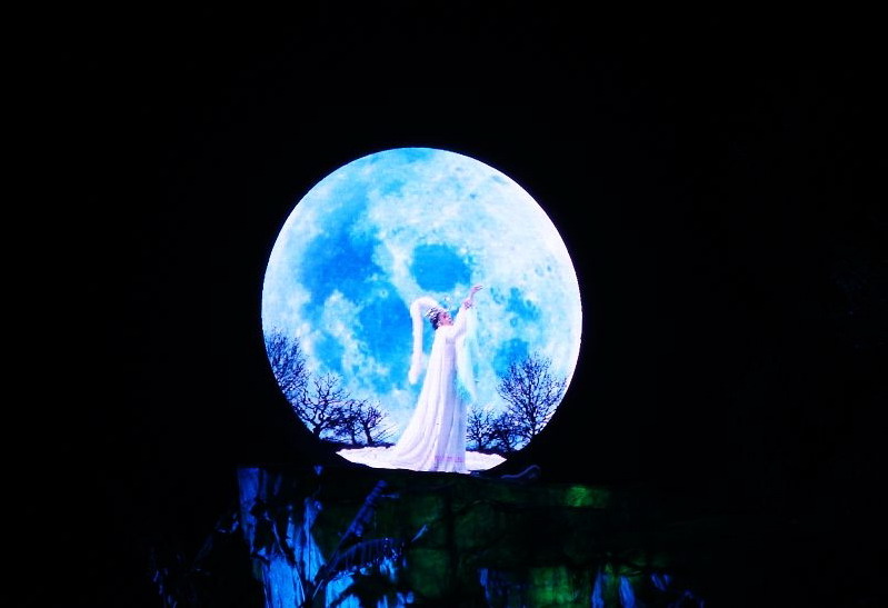 本項(xiàng)目觀眾劇場及主舞臺總占地面積19880平方米,其中全景舞臺10000平方米,采用玻璃鋼設(shè)計,通過燈光效果可通體透亮,營造出奇幻場景。整個表演區(qū)包括:中心舞臺、左側(cè)的人間世界,右側(cè)的狐貍世界、左前歌隊(duì)歌臺、后演區(qū)梯田與木橋?qū)嵕肮参鍌€演區(qū)。