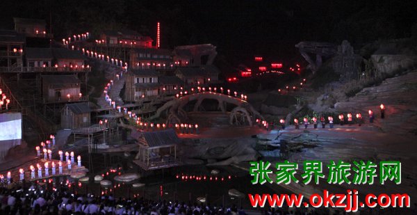 在天門山景區(qū)全球最大的玻璃鋼舞臺上,在開幕式上試演的世界第一臺大型山水實(shí)景音樂劇《天門狐仙》,拉開了’2009中國湖南國際旅游節(jié)張家界民族文化周的序幕。
