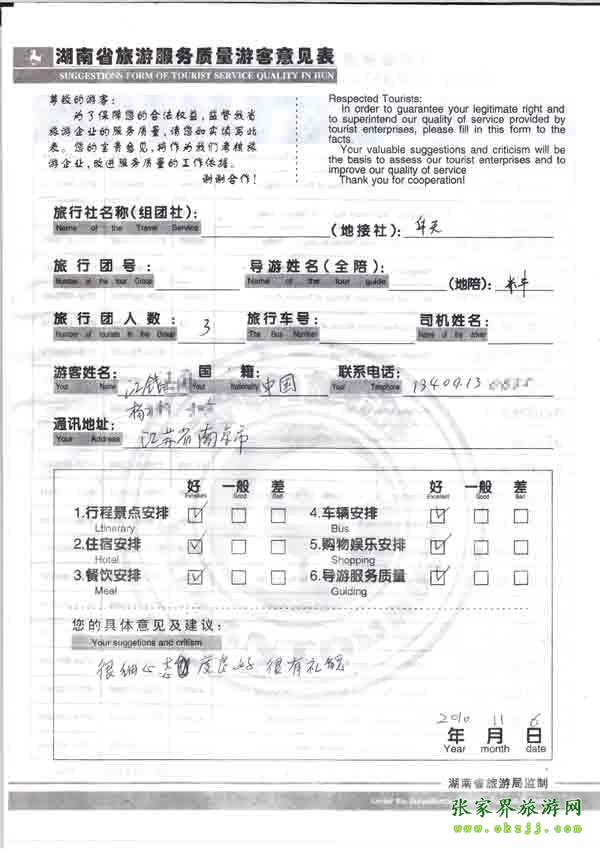 2010年11月6日江蘇楊小姐一行3位旅游質(zhì)量反饋:很細心,態(tài)度好,很有禮貌