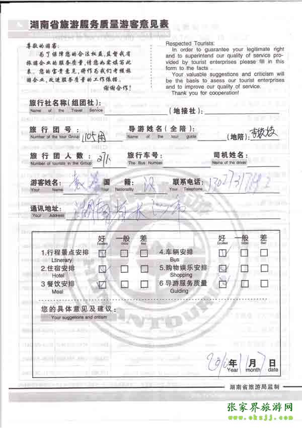 2010年11月7日長(zhǎng)沙袁先生一行27位旅游質(zhì)量反饋