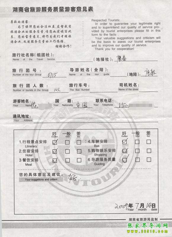 2009年陳女士一行10質(zhì)量接待反饋單: