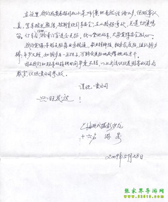 2009年5月19日“上?,F(xiàn)代攝影沙龍”一行16人,參加張家界旅游導(dǎo)游網(wǎng)組織的張家界旅游跟團(tuán),于2009年5月25日結(jié)束行程。游玩期間,由于導(dǎo)游楊蓓的出色講解和周到的服務(wù),得到客人的一致好評(píng)??腿颂丶谋?yè)P(yáng)信一封,如下: