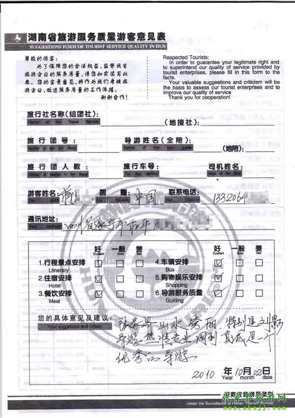 2010年10月2日蔣先生旅游質(zhì)量反饋:導(dǎo)游服務(wù)很好