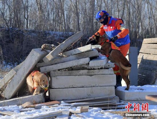 搜救犬正在進(jìn)行廢墟搜索訓(xùn)練。