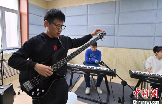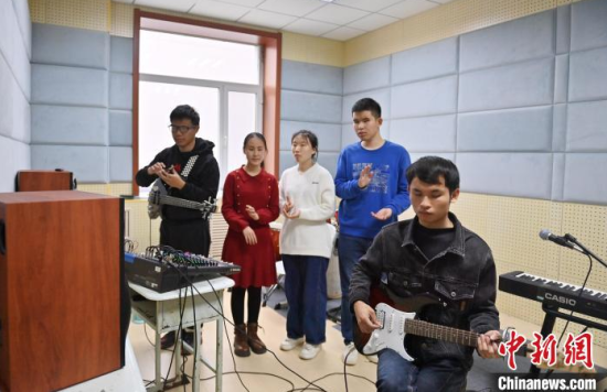 11月14日,吉林長春,“逐暗逐光”樂隊成員在交流排練細節(jié)。長春大學特教學院有一支名叫“逐暗逐光”的樂隊,樂隊成員都是視障學生。他們因音樂相聚在一起,用音樂去驅(qū)逐黑暗追逐光明。中新社記者 張瑤 攝