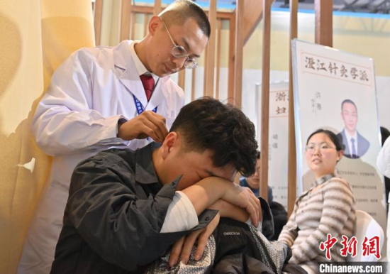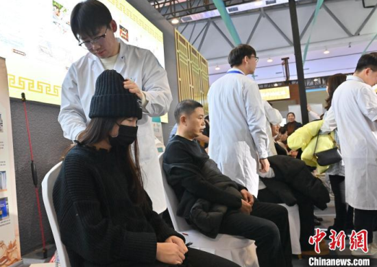 12月7日,吉林長春,市民在體驗(yàn)推拿。當(dāng)天,2024長春國際醫(yī)藥健康產(chǎn)業(yè)博覽會(huì)開幕,現(xiàn)場(chǎng)設(shè)有中醫(yī)藥文化體驗(yàn)展區(qū)、中醫(yī)流派特色療法體驗(yàn)館,吸引大批市民前來觀展、體驗(yàn)。中新社記者 張瑤 攝