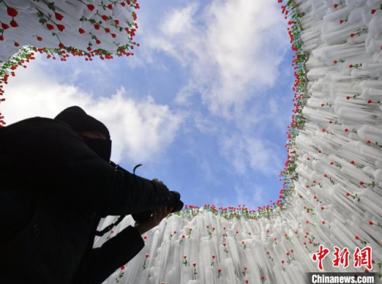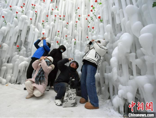12月26日,吉林長白山,游客在冰洞內打卡。進入雪季,長白山推出“愛心冰封玫瑰”吸引大量游客打卡拍照,冰洞內被玫瑰道具環(huán)繞,洞頂呈心形,充滿浪漫氣息。