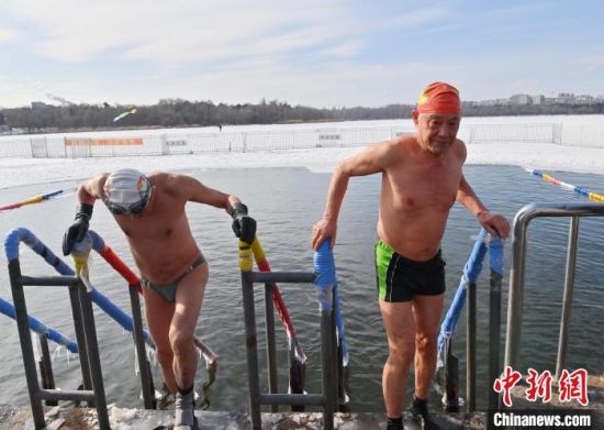 2月19日,在長春南湖公園,吳長海(右)準(zhǔn)備和泳友一起冬泳。今年85歲的吳長海堅持冬泳已有三十余年,冬泳已成為他每天生活中必不可少的一件事。當(dāng)天長春氣溫達(dá)零下17攝氏度,吳長海說,冬泳使他身體強(qiáng)壯,以后會堅持下去。中新社記者 張瑤 攝