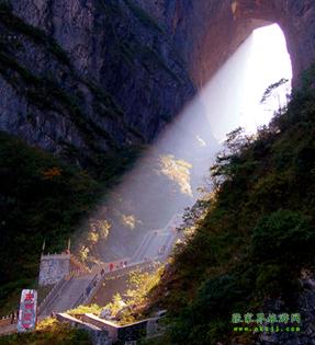 中國(guó)最高的自然“天門洞” 公元263年即三國(guó)吳永安永安六年時(shí),吳王孫休見其高峻雄偉,巍峨壯觀,便將武陵郡分置天門郡,從此天門冊(cè)名傳遐邇,譽(yù)貫古今。天門洞周圍簇涌著丹灶,老僧、玉壺、玉堂、金匱、筆架、將軍、箭桿、漆圓、弩牙、猿點(diǎn)、天姥、負(fù)兒、簸箕、雞籠、高遠(yuǎn)等16座山峰,其間又鑲嵌著雷、電、風(fēng)、云、泥、蛇、龜、祖師、玉皇、鬼谷、果老、玄天、合山、求兒、鐘鼓、老龍等16洞府,幽默盤亙,使得天門山在雄偉之中又增添了神奇和秀麗。流水清洌的澧河為天門山頻映倒影,寬廣低平的田疇為其鋪就如茵綠毯,繁茂的森林裝點(diǎn)著山基和山頂,淡云薄霧為她峨冠霞佩,朝暉夕照為她斜染紅裝。隨著四季的更替,她春茵夏碧秋金冬縞,呈現(xiàn)出無(wú)窮的變幻。天門山生態(tài)系統(tǒng)給天門洞的神奇增添了新的魅力。 據(jù)說(shuō),天門洞開景區(qū)的有上天梯。有著九百九十九級(jí)臺(tái)階的上天梯!