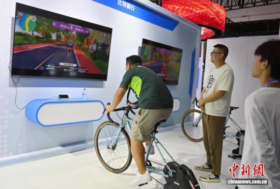 2023年8月24日,吉林長春,市民體驗(yàn)比特騎行,感受數(shù)智競(jìng)技運(yùn)動(dòng)的樂趣。第十四屆中國—東北亞博覽會(huì)首次設(shè)置現(xiàn)代裝備與新能源合作主題館,集中展示人工智能平臺(tái)、新能源智能轎跑、制氫整流電源等裝備和產(chǎn)品。